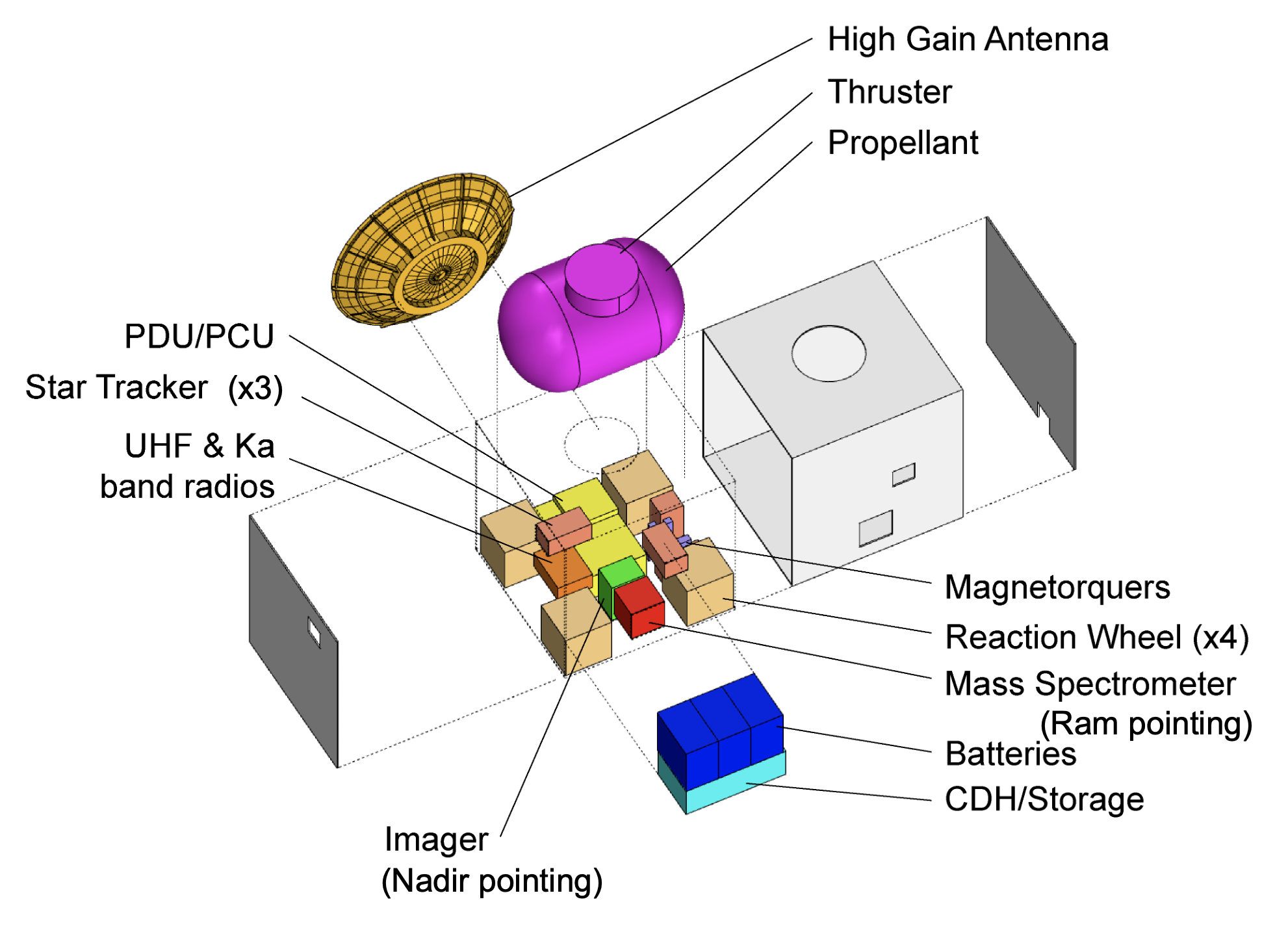 The spacecraft is a 56 kg ESPA-class Small Sat adhering to the SIMPLEx announcement of opportunity. 3mm Aluminum bus panels support all subsystem components, including a 0.4m high-gain antenna and solar arrays with gimbaling capability to ensure optimal array pointing throughout different modes, including minimizing the ram profile during plume flybys.
