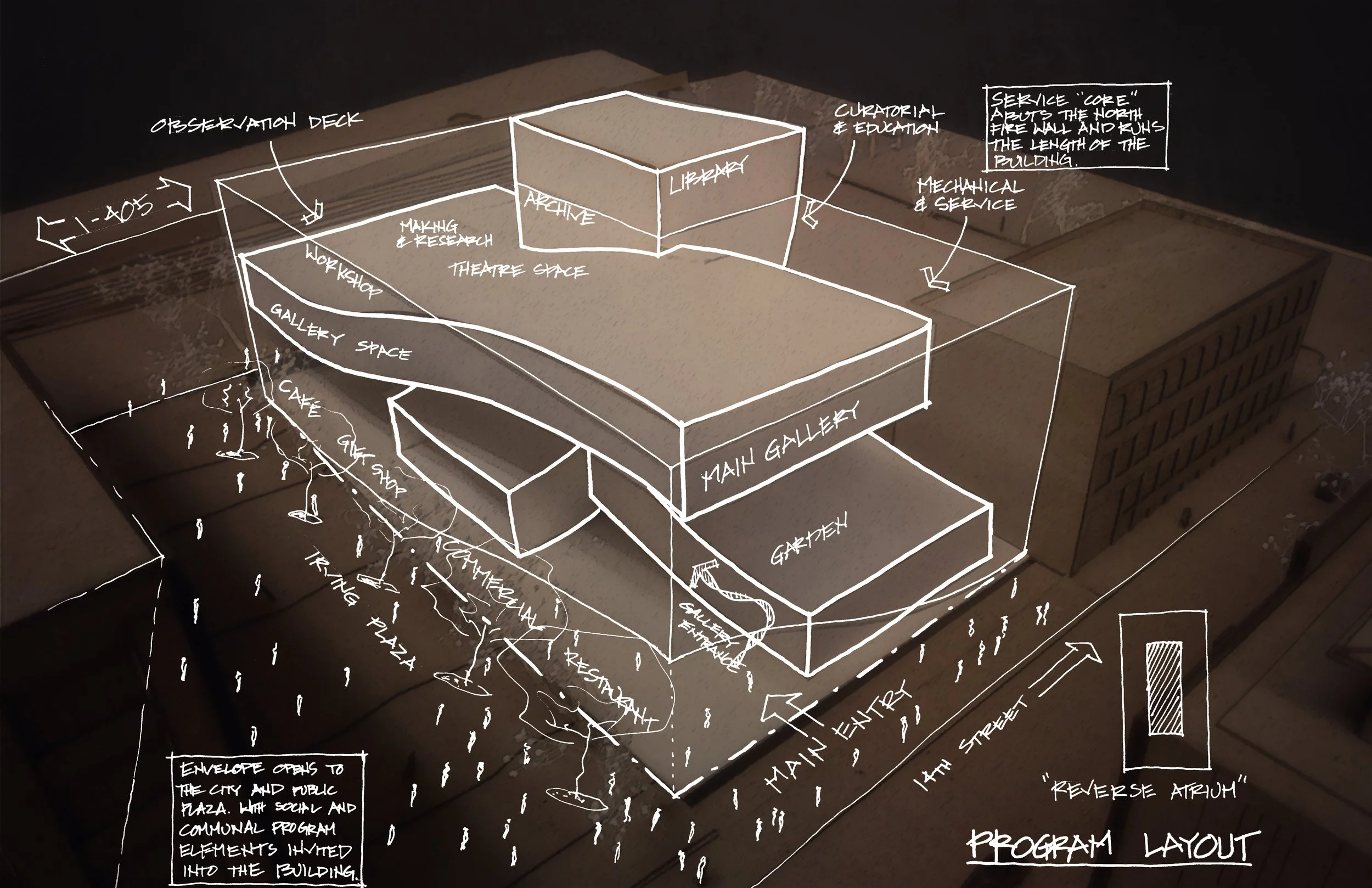 Conceptual design for a building housing gallery space, art restoration, and cultural center. The rich historical context of Russian icons establishes a personal relationship for viewers that expresses itself throughout this project. Building organization creates several layers between the city and the main gallery to protect and intensify this relationship.