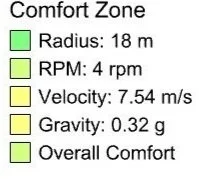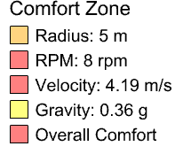 Each of the four comfort indicators are driven from ranges found in Dr. Hall’s research, some of which are implemented directly into the Java version of SpinCalc. This calculator also assesses overall comfort, which can be negated by individual comfort factors going into the red. The two driving parameters, rotational radius and velocity, have associated comfort ranges that are directly controlled, while the effect of the derived variables can be explored with the tool.