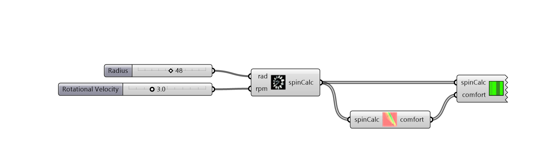 SpinCalc is an artificial gravity comfort calculator developed by Ted Hall, and can be found online here. In searching for a more rapid means of deriving comfort calculations during design iterations, I settled on implementing the calculator in Grasshopper. The plug-ins use Python for calculations and the Human plug-in for on-screen display.